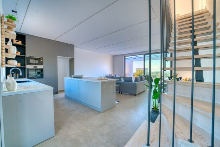 The villa’s spacious terraces surround a large private pool, ideal for sunbathing and summer gatherings. An outdoor kitchen with built-in units and storage is perfect for alfresco dining, while a roof terrace offers 360° panoramic views — the ideal spot for sunset cocktails.