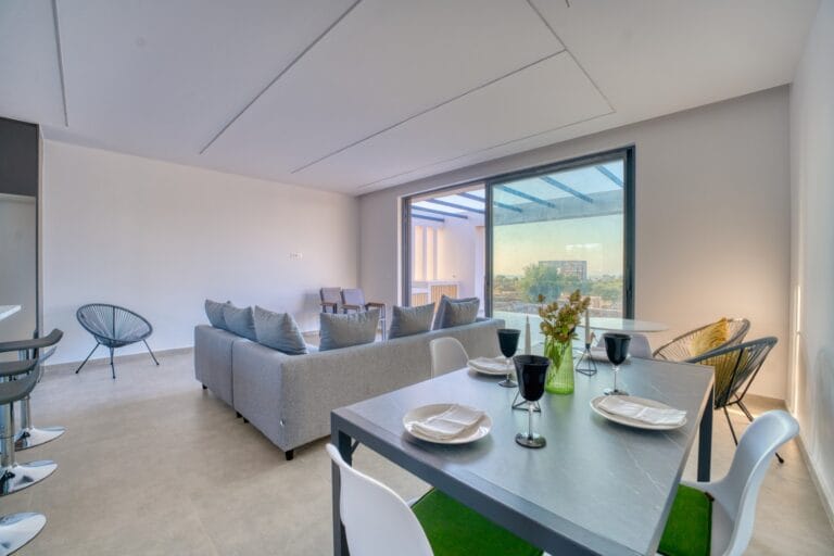 Two spacious ground-floor bedrooms feature fitted wardrobes and private terrace access, while the beautifully finished bathroom boasts a walk-in rainfall shower and double freestanding sinks.