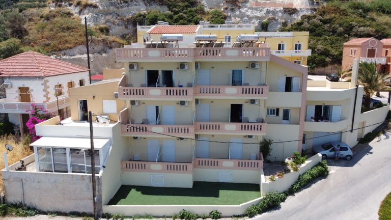 The owner Duplex apartment is on the side and have on the first level an open design Kitchen and Living room with fireplace, a toilet and a big balcony with sea view. A tilled staircase led you to the second level where you will find two bedrooms with a common bathroom and the entrance to the 75 sqm terrace with all around view of sea. This terrace could be of course connected via an external staircase to the rest of the studios, giving to the guest the perfect area for taking their morning coffee. The duplex house could also be rented out to have an extra income.