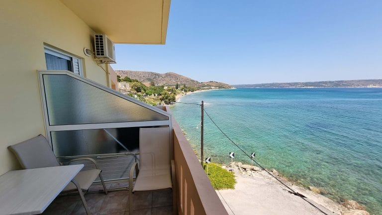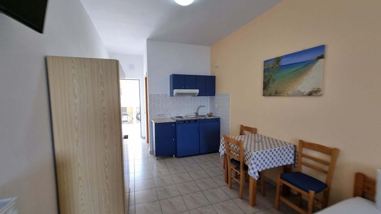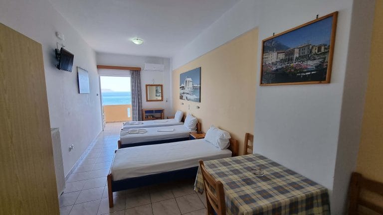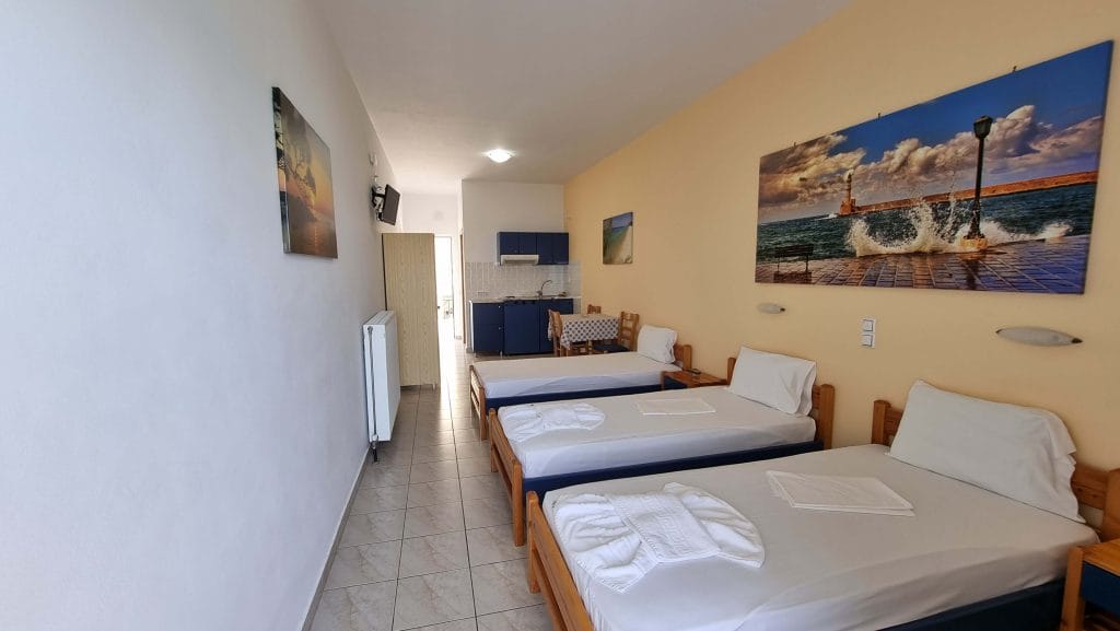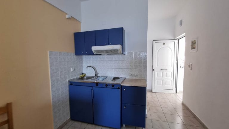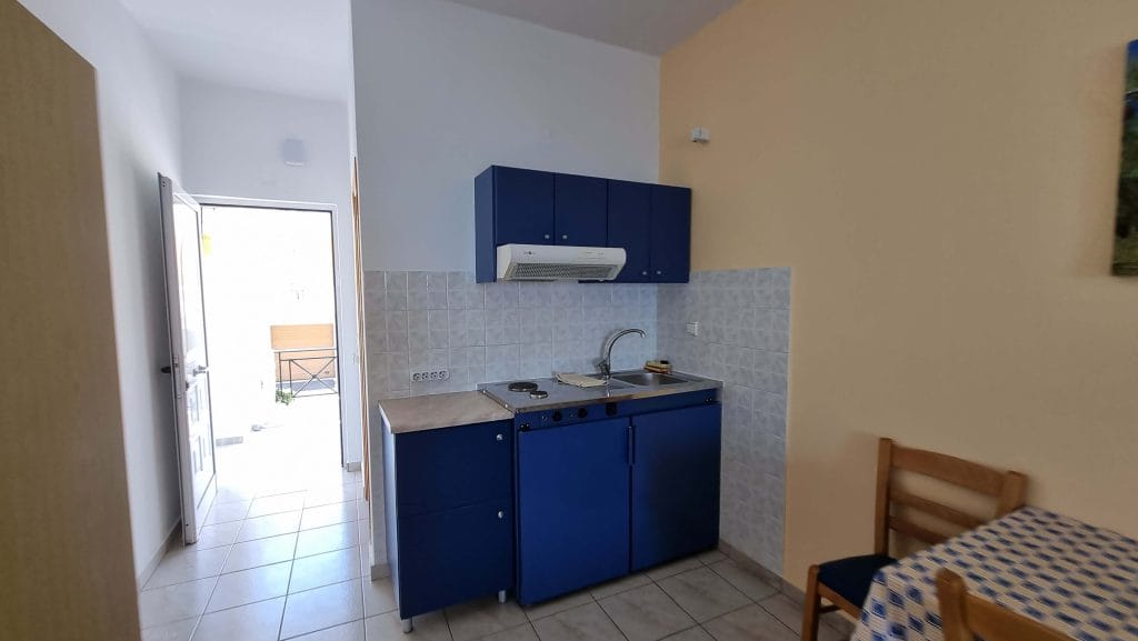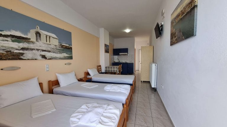 The 12 Studios are fully equipped and are currently functioning at full capacity. They have similar design and are comprise of a shower, a kitchenette, 3 single beds (or two double) and a balcony overviewing the sea that can seat easily 3 persons.