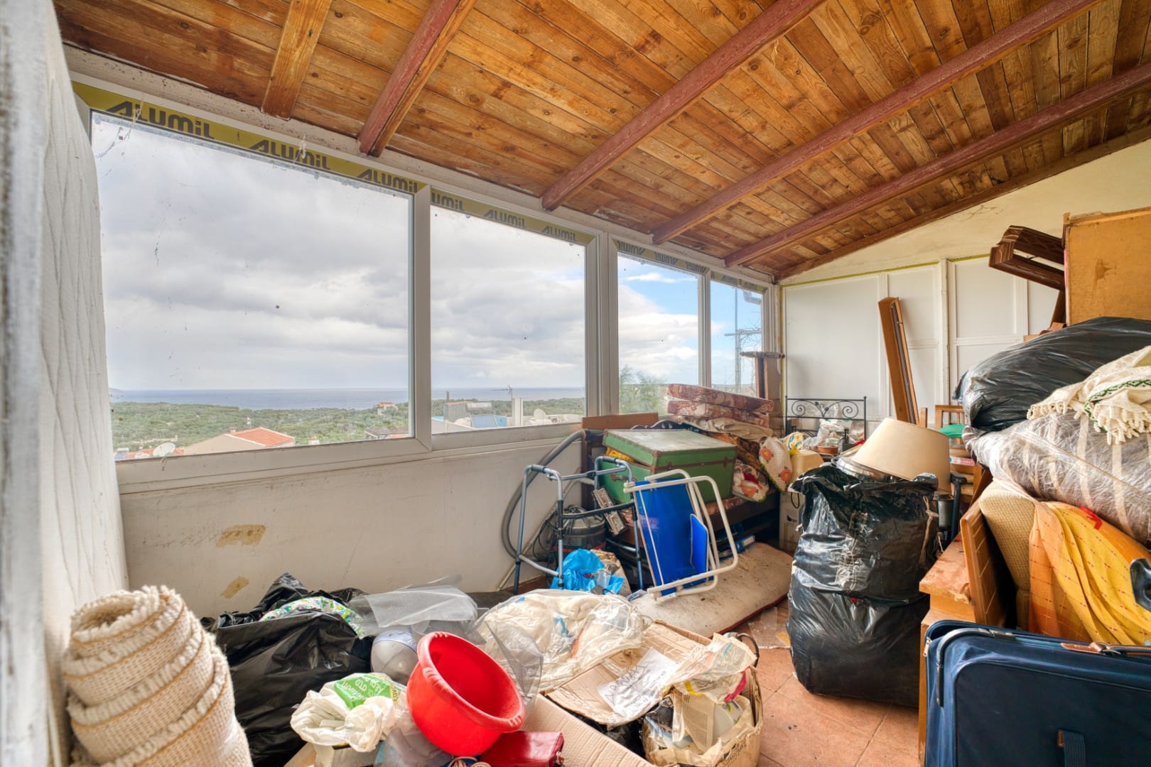 The bungalow-style house is currently habitable but requires a full modern refurbishment throughout. The main level offers two bedrooms, one bathroom, and a spacious open-plan living, dining, and kitchen area. An enclosed elevated balcony provides flexible additional space and could easily be converted into a third bedroom, guest room, or home office. The property will be delivered fully cleared.